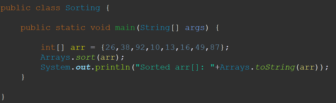 사용법은 매우 간단하다. Arrays.sort(정렬시킬 배열)로 사용한다. sort()함수 내부에서 변수 arr의 순서를 변경해주기 때문에 다시 arr에 할당해줄 필요가 없다.