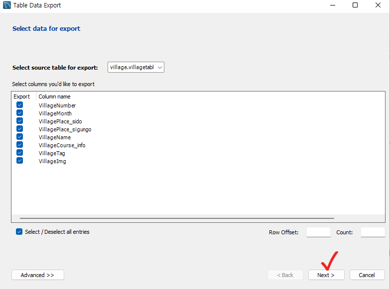 3. Browse..로 저장 선택 - CSV , JSON 중 Export 할 파일 타입 설정 후 Next 클릭