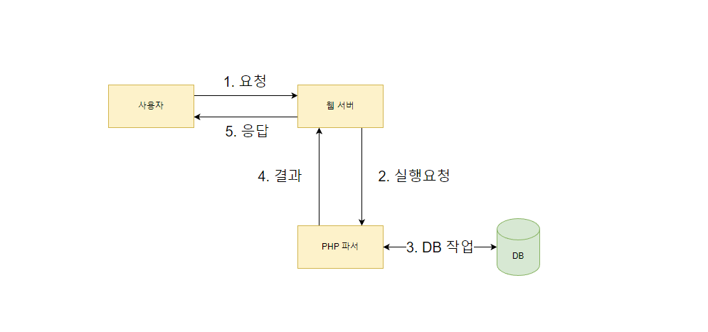 ② 웹 서버는 클라이언트가 요청한 웹 페이지의 로직 및 데이터베이스와의 연동을 위해 PHP 파서(parser)에 이에 대한 처리를 요청합니다.