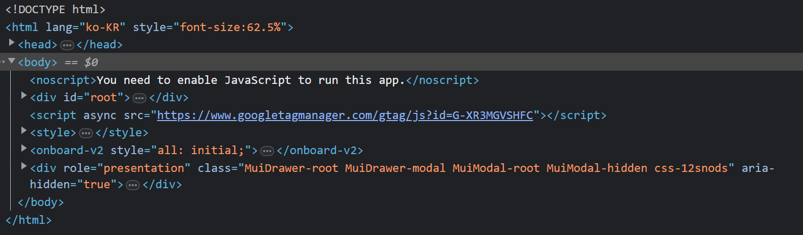페이지에 방문해 개발자 도구로 보면 별다른 것이 없어보이지만 위 코드에서 <onboard-v2> 태그를 열어보면 #shadow-root에 포함되어 있습니다.