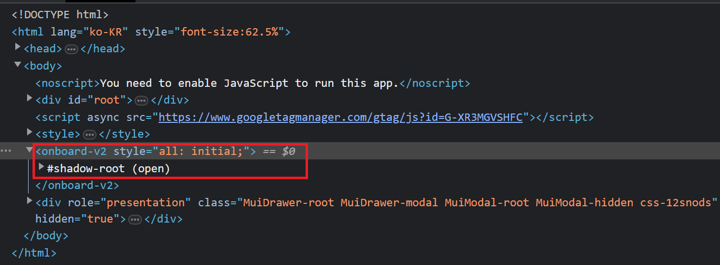 return shadow_root이제 해당 함수를 이용해 찾고자하는 태그에 접근해야합니다. 주어진 HTML 코드에서는 <onboard-v2> 태그를 찾아야합니다.